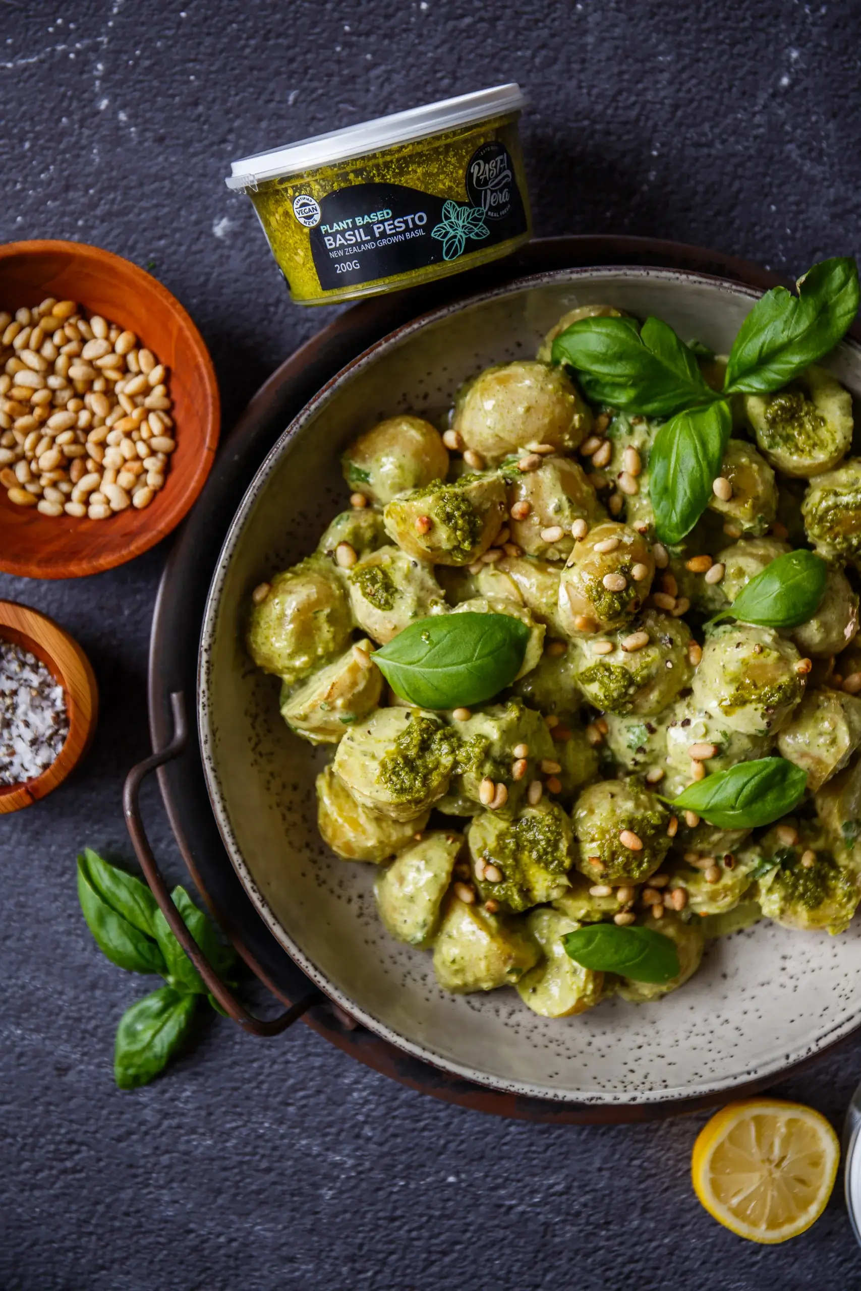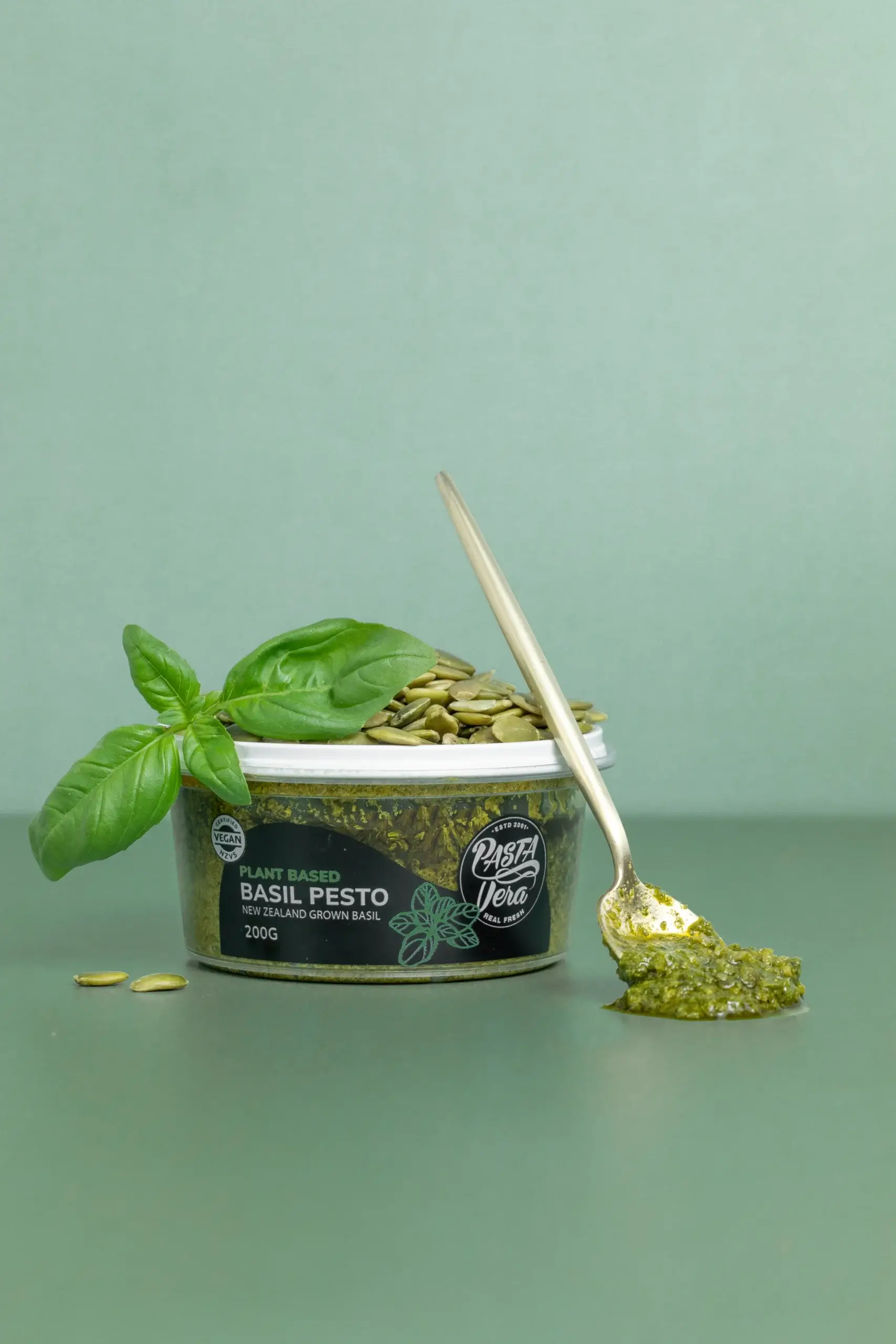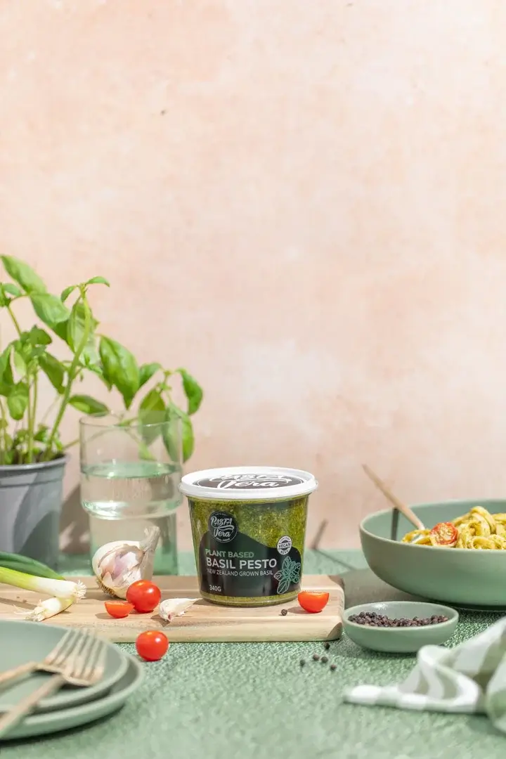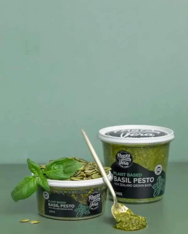 Our gourmet Vegan Basil Pesto is made with basil grown in Cambridge, New Zealand, and pumpkin seeds.